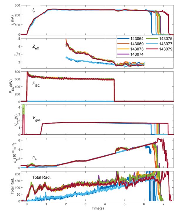 在编号为 1430xx 系列的实验中,研究人员发现了一个反常识的现象。通常情况下,向真空室内大量注入气体(即增加预填充气压)会导致等离子体边缘急剧冷却,从而引发塌缩。但在引入约 600 千瓦的ECRH辅助加热后,情况发生了变化。随着预填充氘气量的增加,等离子体的密度极限不仅没有下降,反而呈现出阶梯式上升的趋势。