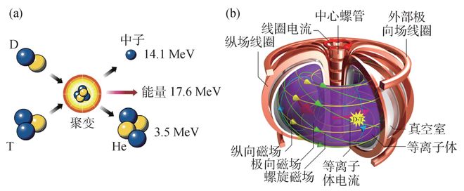 图1 (a)氘氚聚变反应过程示意;(b)托卡马克磁体部件及内部磁场[1]