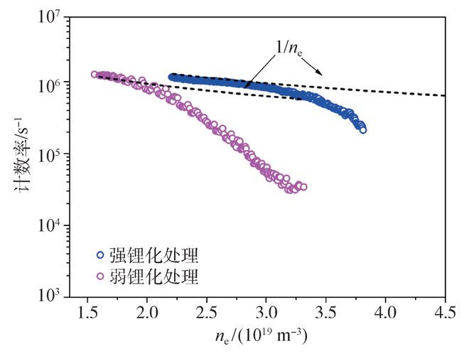 理论研究表明,当注入低杂波(射频特征见图3(b)中的LHCD)的平行折射率N//小于某个临界值时,波场不能在等离子体内传播,即所谓的可近性条件,与波的频率、磁场强度和等离子体密度相关。另一方面,人们发现当等离子体密度大于某个临界值时,低杂波电流驱动效率随密度的下降趋势比理论预言(1/ne)快很多,也就是所谓电流驱动的密度极限。而未来ITER以及反应堆将在极高的密度下运行,高约束等离子体在边界的密度也很高。因此,提升高密度下的低杂波驱动效率具有非常重要的意义,也是目前低杂波电流驱动研究所面临的瓶颈问题。EAST发现边界非线性参量衰变等过程是限制高密度下低杂波电流驱动效率的关键因素,实验中利用锂化壁低再循环条件、电子加热协同、高频低杂波等手段有效地改善了低杂波在高约束、高密度下可近性和电流驱动效率急剧下降的问题(图(4))[5]。