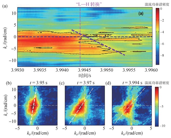 图6 (a)在EAST上观测到的“L—H转换”期间湍流径向波束谱移动的实验现象;(b)—(d)湍流结构随时间被平均剪切流逐步扭曲(kr为湍流径向波数,kθ为湍流极向波数)