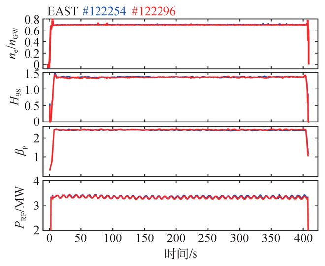 图11 EAST实现403 s高约束长脉冲运行典型(#122254,#122296)的等离子体参数信息:等离子体密度ne与密度极限nGW的比值,能量约束因子H98,极向比压βp和射频注入功率PRF