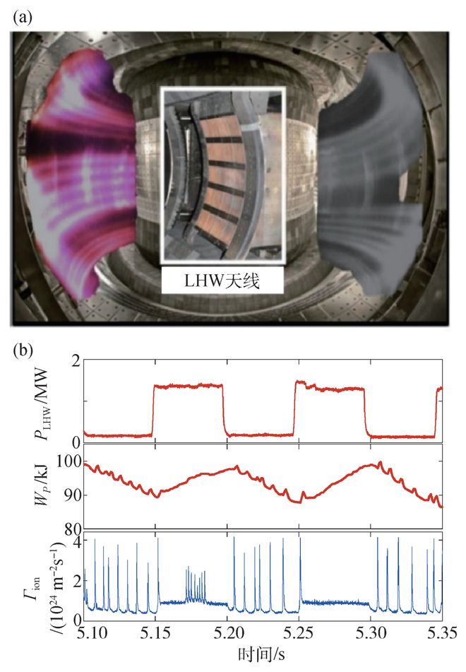 图7 (a)在EAST上利用可见光相机拍摄的由低杂波(LHW)驱动的边界螺旋电流带;(b)信号自上而下分别是低杂波注入功率、等离子体储能以及靶板上的粒子流,用于边界局域模脉冲信号表征