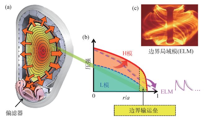 图5 (a)托卡马克极向切面示意图,等离子体被约束在层层嵌套的磁面内,下方阴影区为偏滤器部件;(b)低约束模式、高约束模式的压强剖面特征。高约束模式在边界形成的台基状结构(输运垒)提高了等离子体整体参数,输运垒很高的压强梯度会激发称之为边界局域模(ELM)的不稳定性;(c)英国MAST装置上利用快速可见相机拍摄到边界局域模,像是等离子体表面喷出的“火舌”[9]