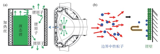 图10 (a)EAST上的锂化壁处理手段;(b)锂壁吸附边界中性粒子示意