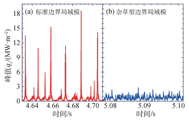 图8 标准大幅度边界局域模 (a)和杂草型小幅度边界局域模(b)在偏滤器靶板上的峰值热通量