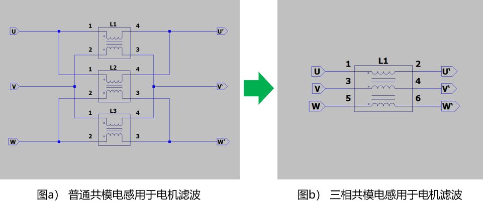 3) 三相共模电感可以看作是为三相无刷电机量身定做的滤波器件,利用1颗器件可替代常规的3颗器件,节省空间、节省成本还能提高产品可靠性。