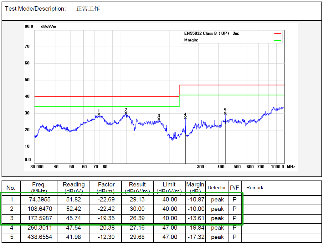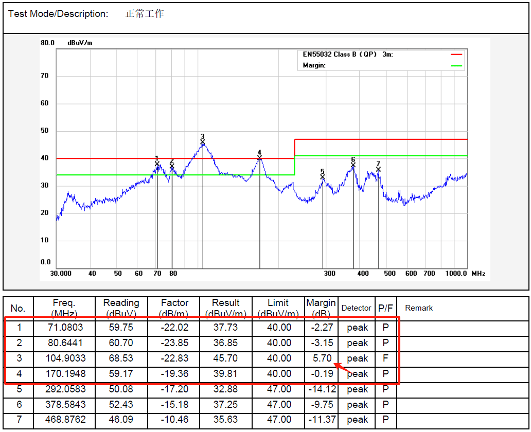从测试频谱图看,100MHz附近的大包像是典型的电源开关噪声类噪声产生的辐射,现场定位分析,噪声源也确实是电机的开关驱动模块所产生的噪声;