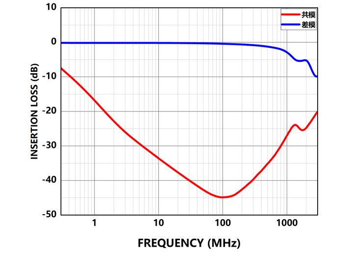 BWCF1243P500L4A5三相共模电感中的两组共模线圈的共模和差模插损曲线,可以看出该器件的共模插损有效区间较宽(-20dB @ 1.5MHz ~ 3GHz),在30M~300MHz范围内均有40dB的插损,而我们产品的实际噪声范围(65M~200MHz)刚好落在器件的高插损范围内,所以此器件用上后,产品噪声水平明显下降。