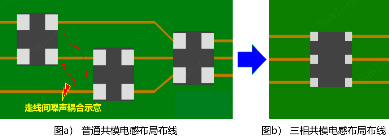 图9 普通共模电感vs三相共模电感(布局布线组信号线上应用时的布局布线的局限性,可能会存在未经过滤波的信号线上的噪声又耦合到已经滤过波的较干净的信号线上,形成“二次污染”,导致实际的滤波效果大打折扣;而三相共模电感只有一颗器件,若布线合规,输入输出可基本做到相对隔离、不同信号线间的耦合干扰也不影响最终的滤波效果。