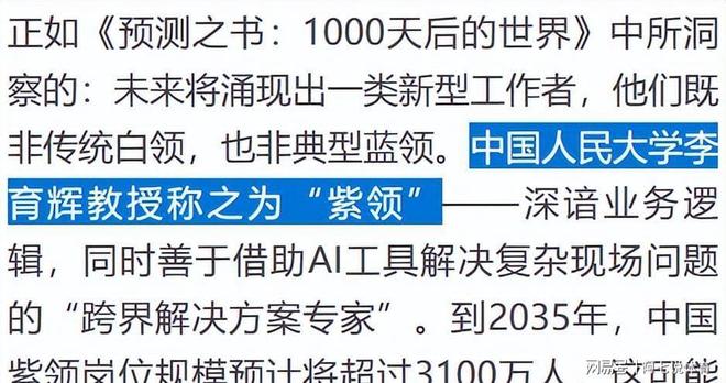 所谓的紫领,就是那些既懂具体业务逻辑,又会用AI工具解决复杂现场问题的人,根据预测,到2035年,这种工作岗位的规模会超过3100万人。