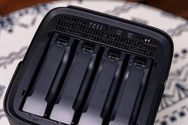 硬盘采用竖向安装,打开顶部的磁吸盖板,就能看到四个硬盘托架。托架配有减震垫,采用免螺丝安装,移动侧边即可卡上硬盘。厚实的防震垫大幅减少了震动,与机身软连接的方式可以更好地保护硬盘内的数据。
