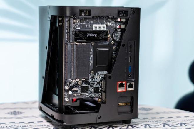 内存方面,该机标配16GB DDR5内存,支持双插槽扩展,最大扩容128 GB。打开一侧的铝合金饰板就能看到内存安装插槽,以及4个PCIe 4.0 M.2固态硬盘插槽。另外机身配备32GB eMMC存储,综合来看这样的配置在X86架构NAS中确实算得上天花板了。