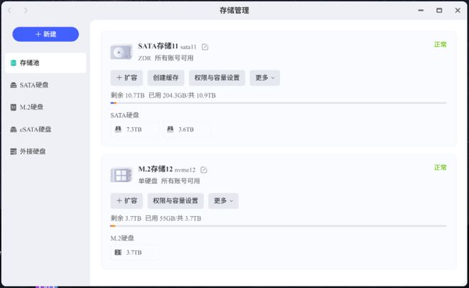 极空间Z425支持多种硬盘备份模式,包括ZDR、RAID1、RAID5、RAID6(最新更新中刚刚支持)等。其中ZDR是极空间专属动态备份技术,可以有选择地将重要的文件自动备份到另外一块硬盘上,与RAID1相比,既保证了重要数据的安全,又节省了存储空间。本机设置为ZDR模式以后,两块硬盘加在一起总可用空间达到了10.9TB。