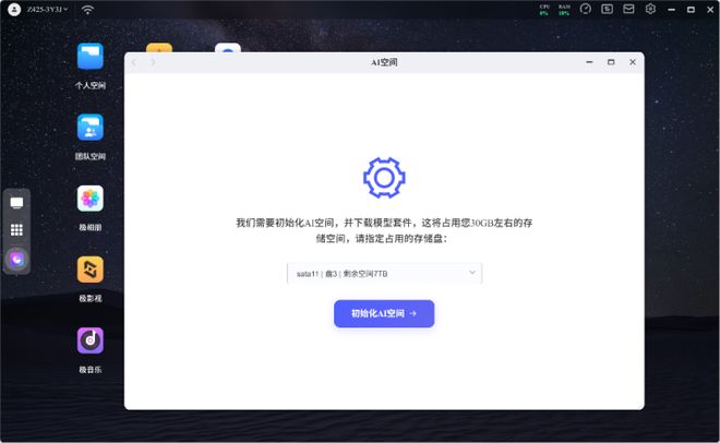 使用AI空间会先进行初始化工作,大约占用30GB左右的空间来下载模型套件,并且提供针对intel CPU和NVIDIA两种类型的模型,假如你使用雷电接口连接了外置显卡,那么就选择NVIDIA模型。