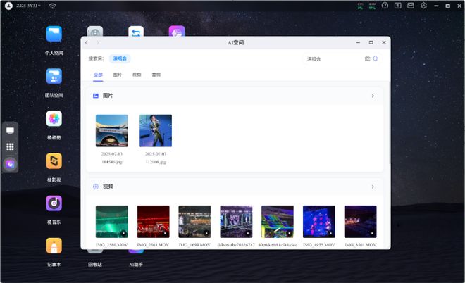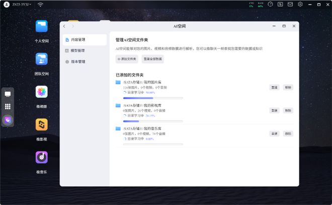 正如前面提到,Z425拥有强大的本地算力,而这恰恰是端侧AI的基础。2023年极空间就率先提出“AI NAS”概念,将系统与AI 深度融合,为用户带来更智能的数据管理体验,而现在,新推出的AI空间正是极空间为专业创作人群提供的一站式AI多媒体文件管理中枢。