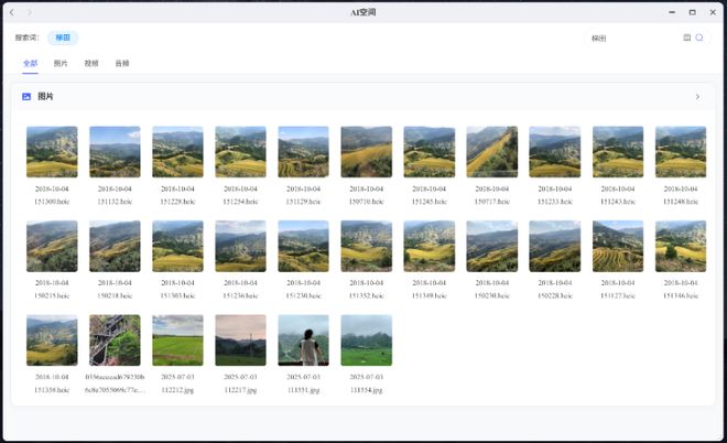 比如我们存储的照片中,可能有大量的人物,包含多位家庭成员的面孔,还有许多宠物的照片,以及风景照等。使用AI空间的本地大模型能力,你就很容易从数万张照片中找到想要的。例如搜索关键词“梯田”,就会从图片里精准找出含有梯田地形的图片,检索非常高效。